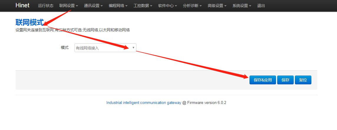 1. 网关后台联网模式是否正确,进网关后台,点击“联网设置 - 联网模式”,修改模式为“有线网络接入”,再点击【保存应用】,重启网关生效。